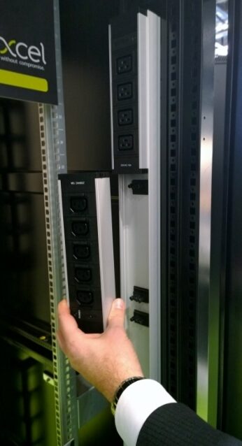 We also liked the plug in PDUs offered by Excel. They are plugged in mechanically and electrically. If you need to quickly move one up or down or to the other side, just pull it out of the socket and position it where you want. Really neat idea.